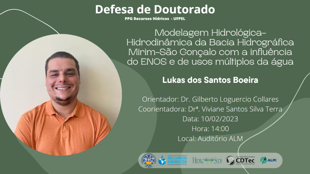 O grupo Hidrosedi fica feliz em convidar a todos para assistirem a defesa de tese de doutorado do pesquisador Lukas dos Santos Boeira, com o titulo: Modelagem Hidrológica-Hidrodinâmica da Bacia Hidrográfica Mirim-São Gonçalo com a influência do ENOS e de usos múltiplos da água.