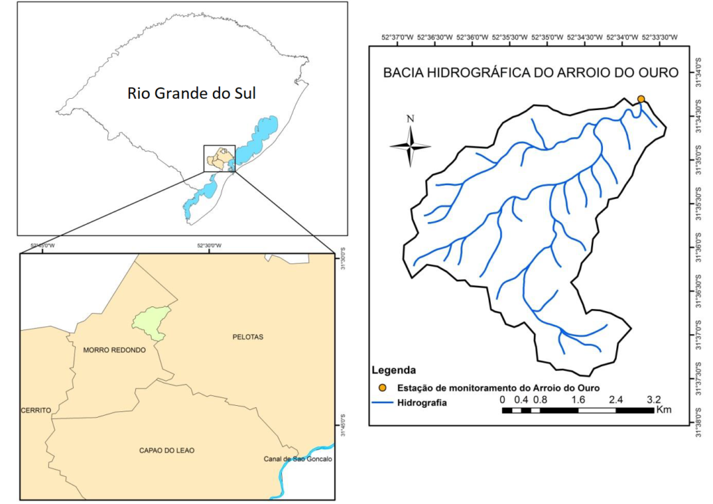 A bacia hidrográfica do Arroio do Ouro é uma sub-bacia do Arroio Cadeia que compõe a bacia hidrográfica do Arroio Pelotas, e se localiza entre os municípios de Pelotas e Morro Redondo, RS. A bacia está inserida na região geomorfológica do Escudo Sul-Rio-Grandense, no qual o seu escoamento converge para a bacia hidrográfica Mirim-São Gonçalo que compreende 9 municípios da região Sul do Estado do Rio Grande do Sul, com uma extensão de 25.961,04Km2 (SEMA, 2015). A bacia hidrográfica deste estudo possui como principal ocupação a agricultura em pequenas propriedades familiares, observando-se o cultivo de espécies como pêssego, milho e tabaco, além de atividades de pecuária leiteira e avicultura.