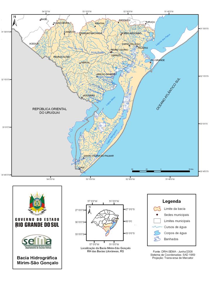 A Bacia Hidrográfica Mirim-São Gonçalo situa-se no sudeste do Estado do Rio Grande do Sul entre as coordenadas geográficas 31º30′ a 34º35′ de latitude Sul e 53º31’a 55º15′ de longitude Oeste. Abrange as províncias geomorfológicas Planície Costeira e Escudo Uruguaio-Sul-Rio-Grandense. Possui área de 25.961,04 km², abrangendo municípios como Arroio Grande, Candiota, Canguçu, Capão do Leão, Chuí, Jaguarão, Pelotas, Rio Grande e Santa Vitória do Palmar, com população estimada em 744.021 habitantes. Os principais cursos de água são os arroios Pelotas, Passo das Pedras, Basílio, Chasqueiro, Grande, Juncal, Chuí, do Vime, Seival, Minuano, Lageado, Taquara, Candiota, Butiá, Telho, do Quilombo e os rios Piratini e Jaguarão, além do Canal São Gonçalo, que faz ligação entre a Lagoa Mirim e a Laguna dos Patos. Os principais usos da água se destinam a irrigação, abastecimento humano e dessedentação animal.